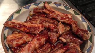 Jab an instant-read thermometer into a thick part of the meat. If it clears 160 degrees, take them out of the oven. If not, give the ribs more time till it does. Take the slab or slabs out of the pan and put them on a plate to rest. This is a good reason to have tongs.