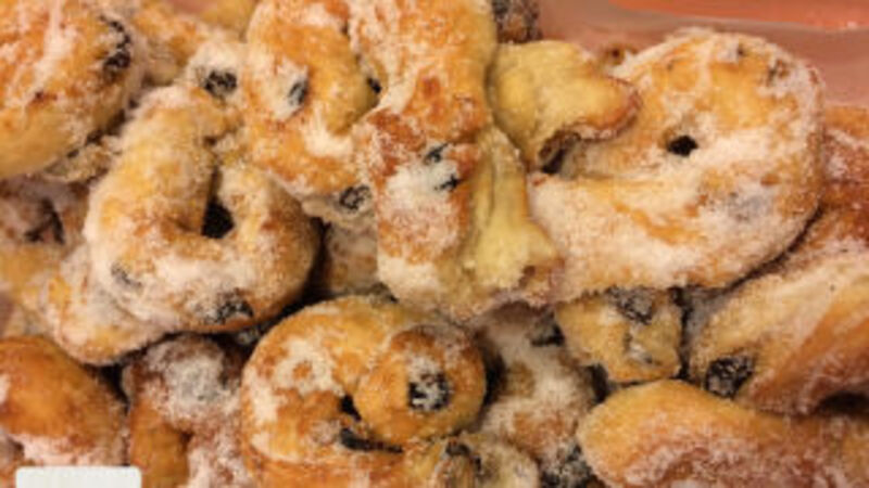 Unlike zeppole or bombolone, scuppels are multi-faceted and bi-purpose. When cooked on the day of, they are light and fluffy and donut-esque like a typical yeast donut should be. Served the next day, though, they become bread-like and dense, making them heavier but equally delicious. They are dotted with raisins and covered in sugar, and, strangest of all, they are made into a rope-knot shape similar to a breast cancer awareness ribbon.
